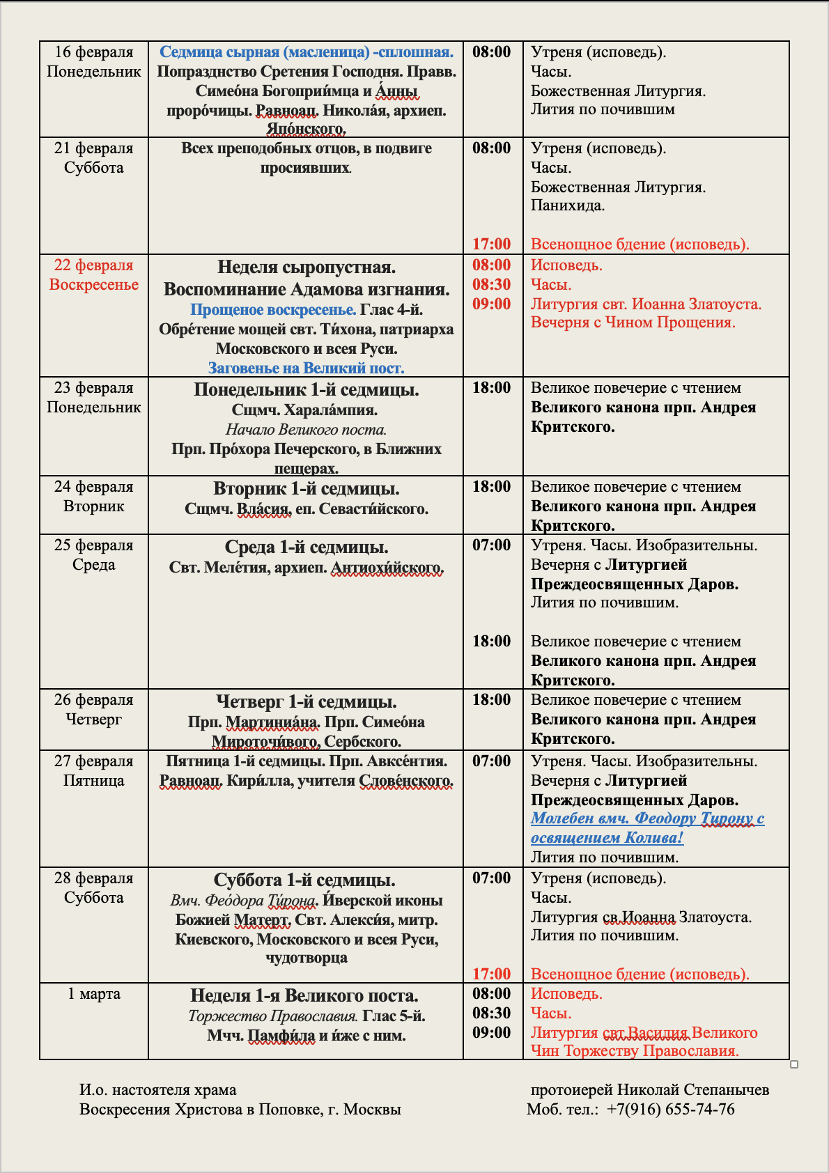 Расписание служб