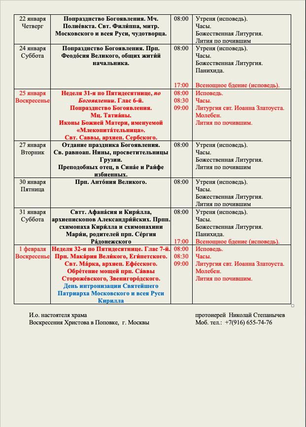 Расписание служб